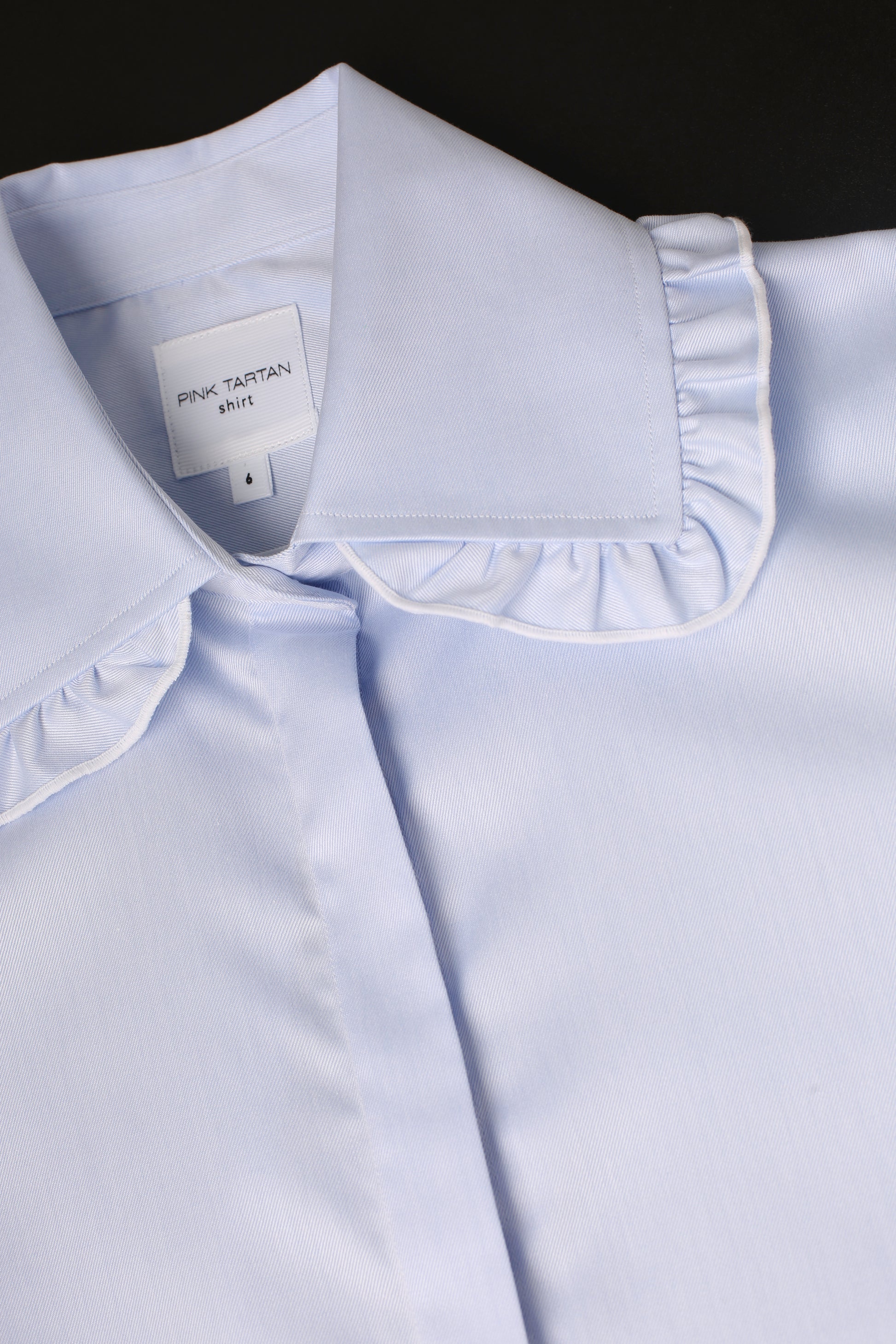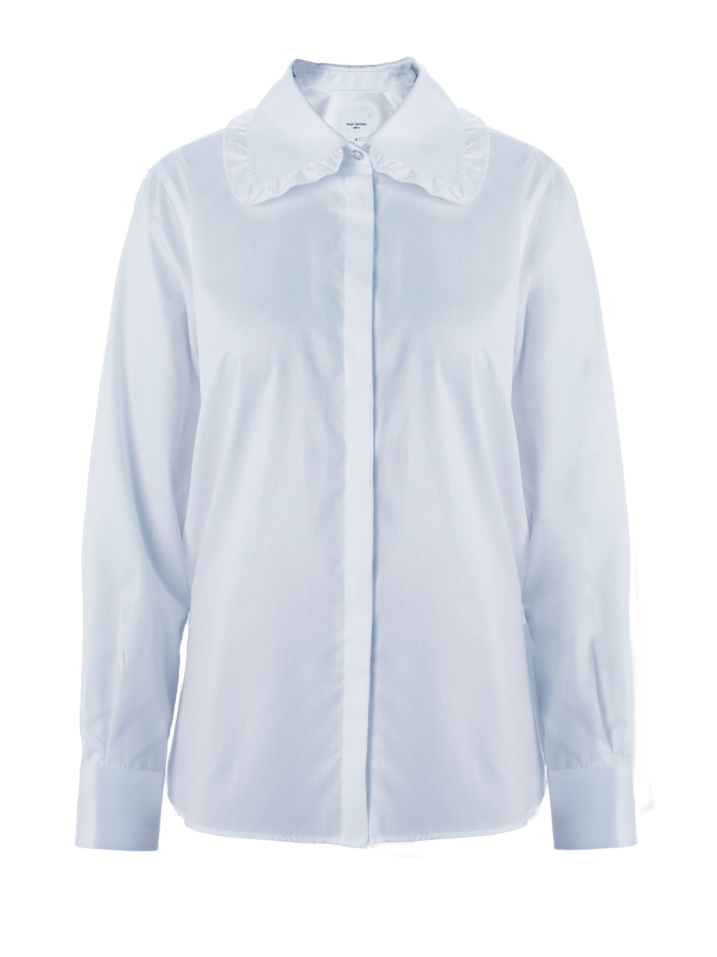 Ruffle Collar Shirt - a stylish and versatile addition to your wardrobe. This shirt features an exaggerated ruffle Peter Pan collar, adding a touch of femininity and flair to your wardrobe. So versatile, you can wear this shirt underneath your favourite layering piece or by itself.